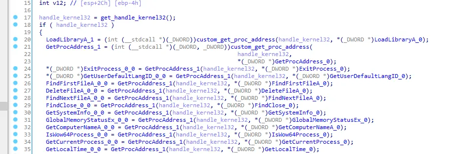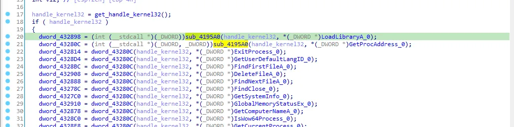 Next we see that (handle_kernel32) is passed to sub_4195A0 function to resolve LoadLibraryA and GetProcAddress.