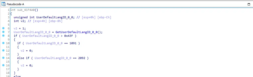 We see that there is GetUserDefaultLangID call so let’s rename v1 to UserDefaultLangID. sub_41F4A0 call is comparing the default language ID of the pc with some other IDs if the IDs are the same the function will return 0 and the malware will stop execution.