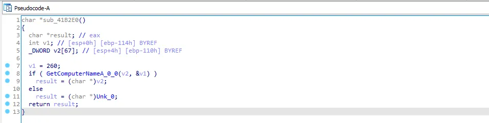 I will call this function “Get_Computer_Name” and go back to sub_41B700. We see that the function sub_41B2E0 is returning in v0