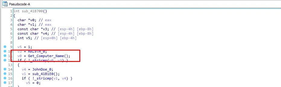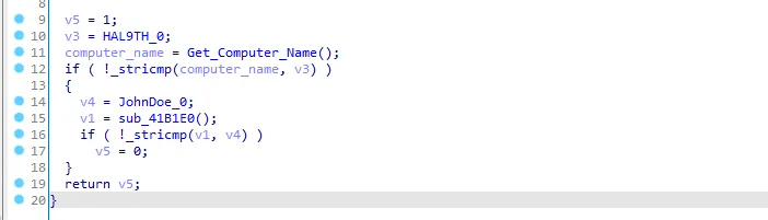 so let’s rename v0 it to “computer_name”. Then “computer_name” function will be compared with v3 and v3 is HAL9TH if they are equal it returns zero which means that the malware is being analyzed so the malware will stop execution