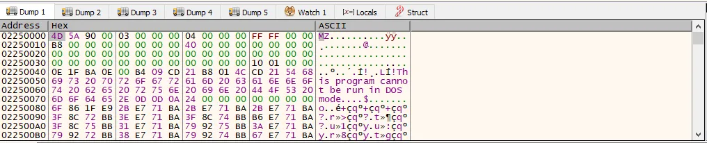 If we followed EAX in dump and ran the debugger for the second time, we will see strange strings, but if we did it for the third time, we will see that there is another PE file generated. Let’s dump it to a file with name “droppedfile_2.bin” and try to analyze the dropped files.