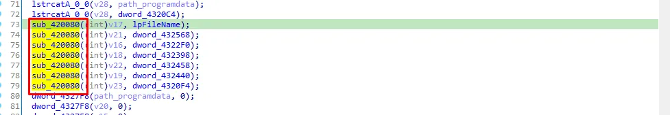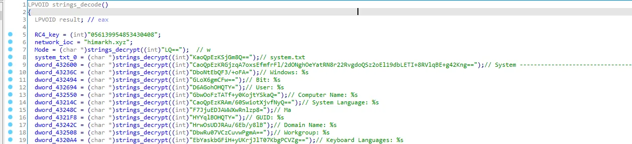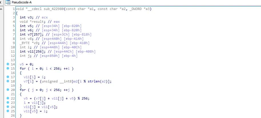 from sub_422980 call we know that the cipher used is RC4, I’ll call sub_422980 “RC4_decrypt” and sub_422F70 to “strings_decrypt”.