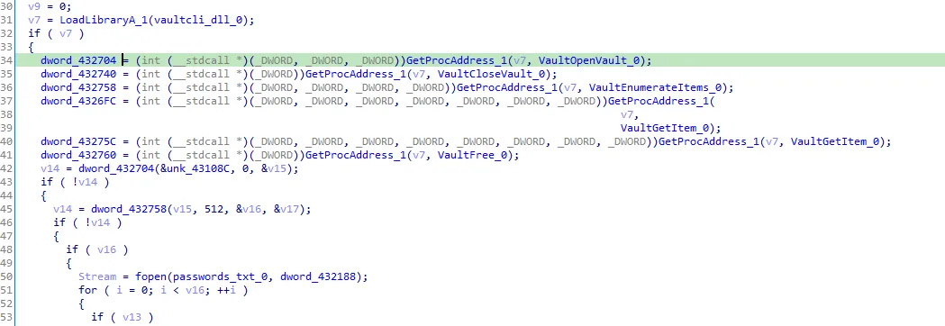 If we searched for VaultOpenVault and the other functions we will know that these functions is used to steal Internet explorer data. So this function steals IE data. I’ll call it “steal_data”